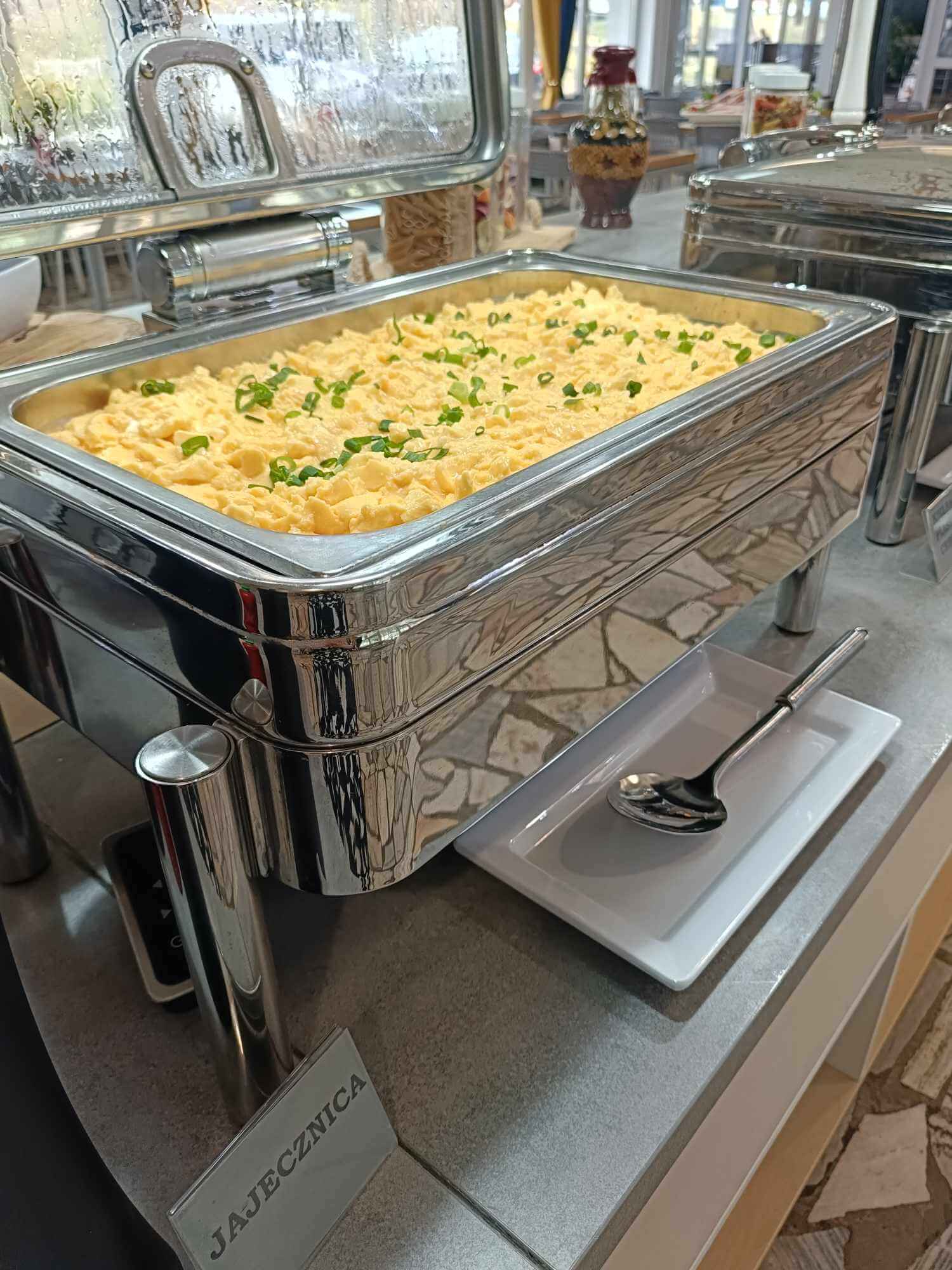 Jajecznica, Placuszki z jabłkami, Kiełbaski, Zupa mleczna
