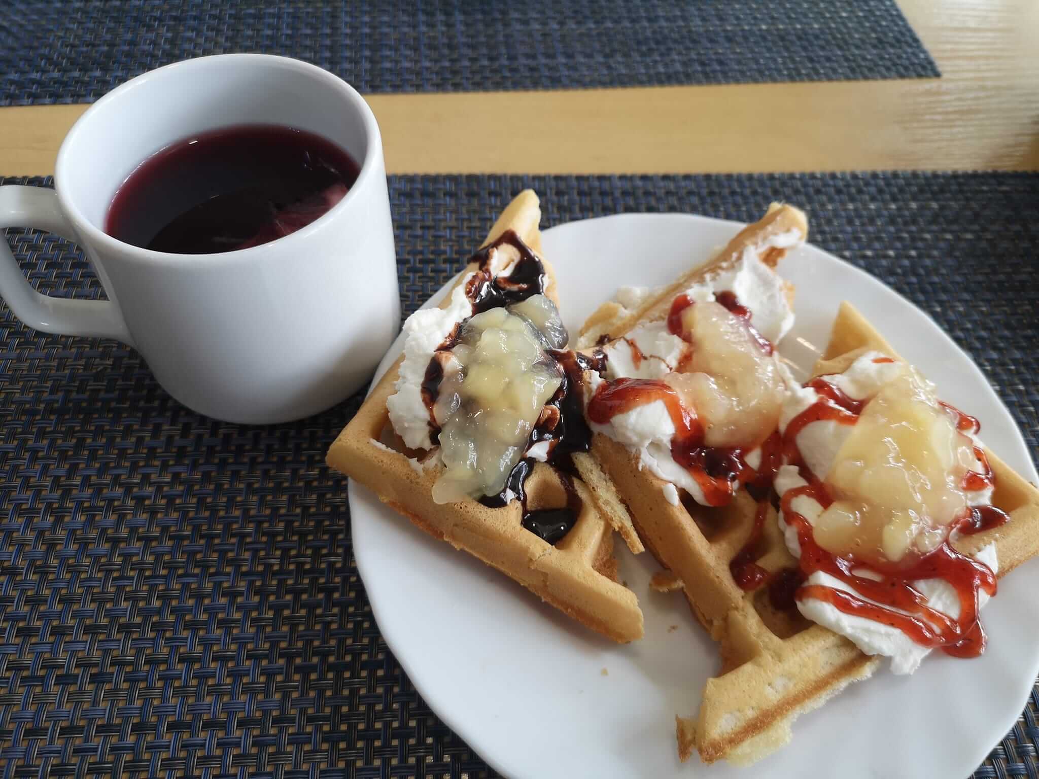 Gofry, Kiełbaski , Jajka gotowane, Zupa mleczna