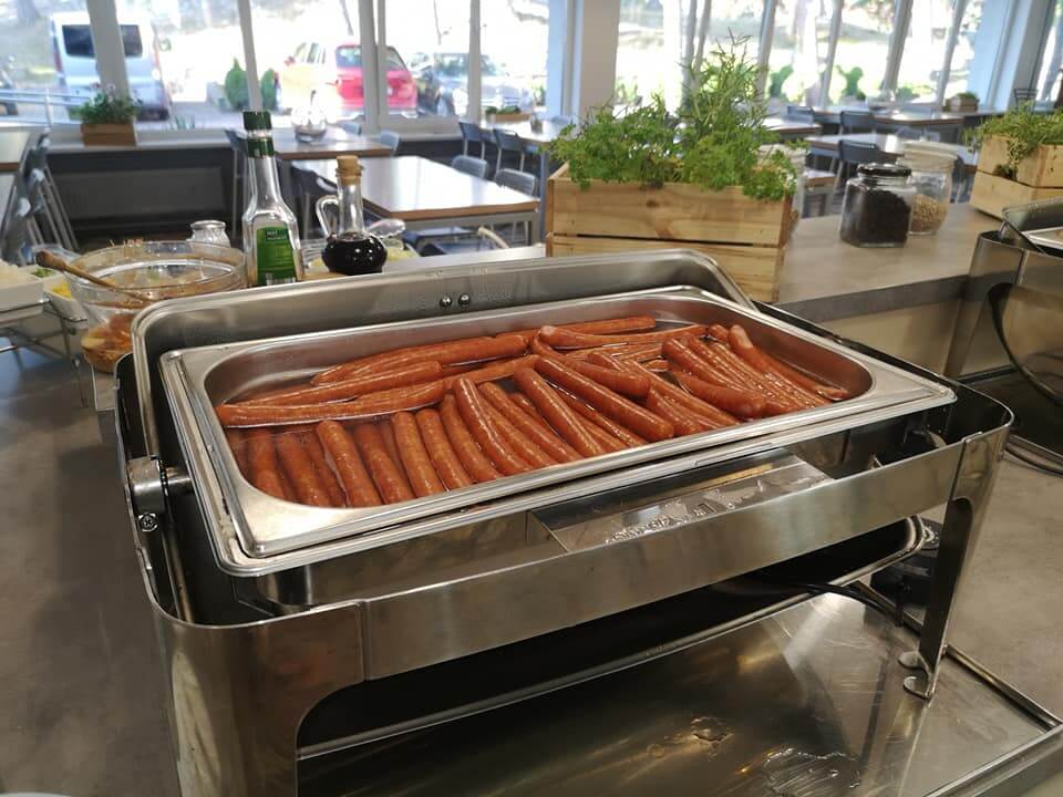 Kiełbaski, Placki z jabłkami, Jajka gotowane, Zupa mleczna